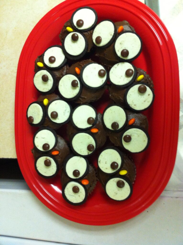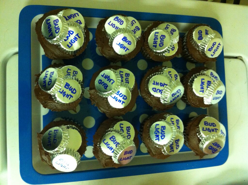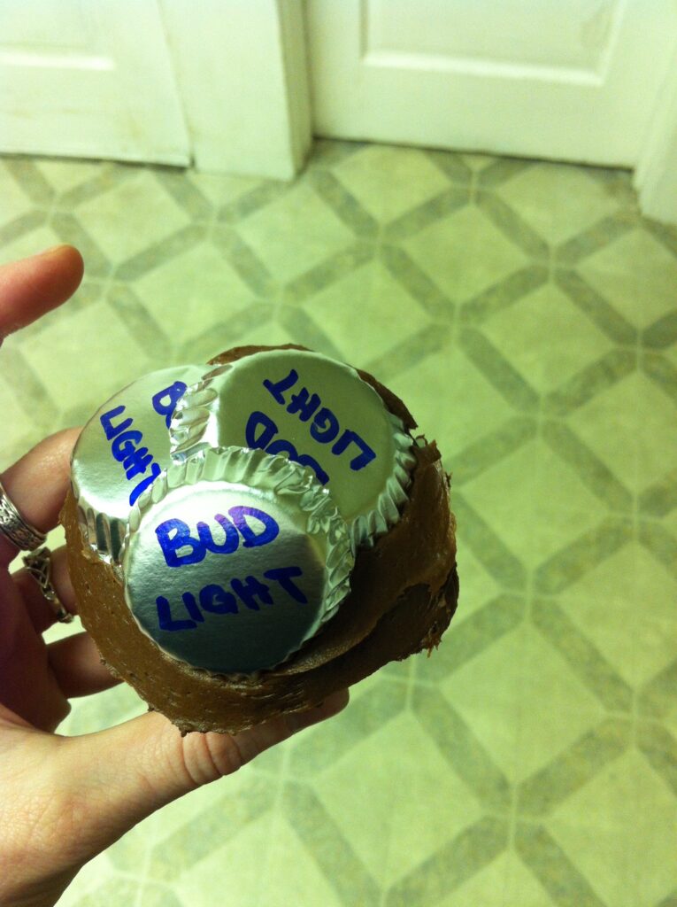 Our friends Kat and Kayla both have birthdays at the end of October, so they decided to have a joint birthday party this year! I made the Owl cupcakes for Kayla because she loves owls. They're made from Oreos and Reese's Pieces. The Bud Light cupcakes are for Kat because she loves Bud Light. The "bottle caps" are made from mini cupcake wrappers that I trimmed down to size and labeled.