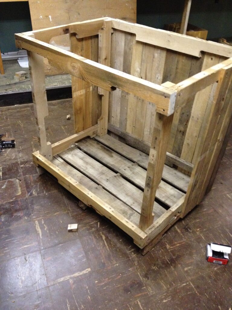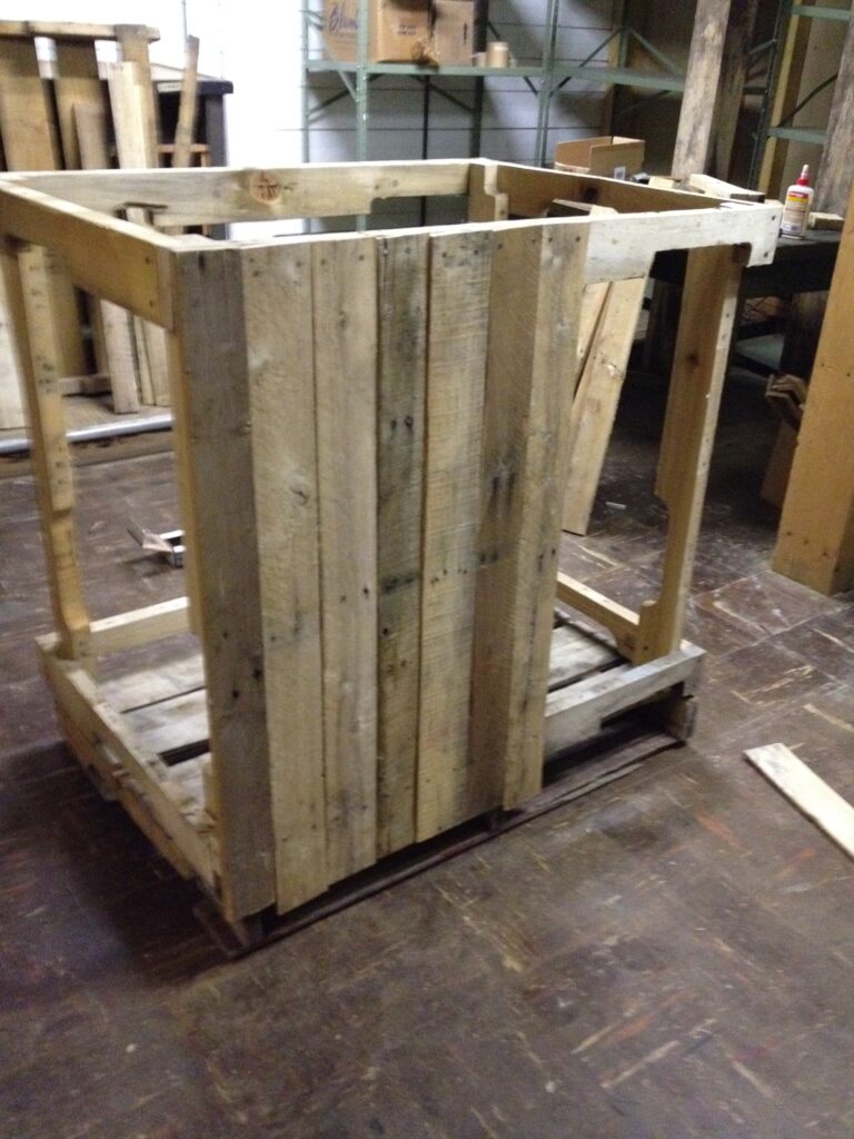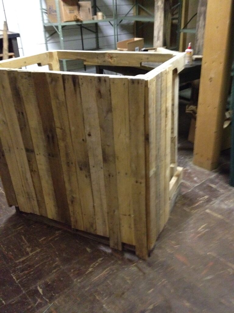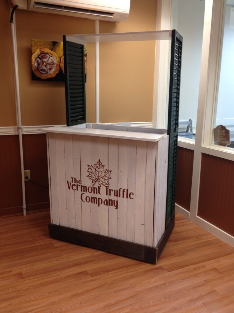 The whole thing is made out of recycled pallet wood, aside from the shutters that make the sides (which I got at a yard sale), and is on wheels so it could be moved outside for the street party events that downtown hosts every summer. We were able to borrow a projector to project the logo onto the front of the stand which I then hand painted. The back panels of the stand are removable so the freezer can be accessed for maintenance if needed. There are two additional counter pieces that can be set on top of the frame and a shelf piece that can be added half way up the sides so when it's not ice cream season, the piece can be used as a display case in the store. I strung up twinkle lights so when night fell during the street party, people would still be able to see the booth and I would still be able to scoop ice cream.