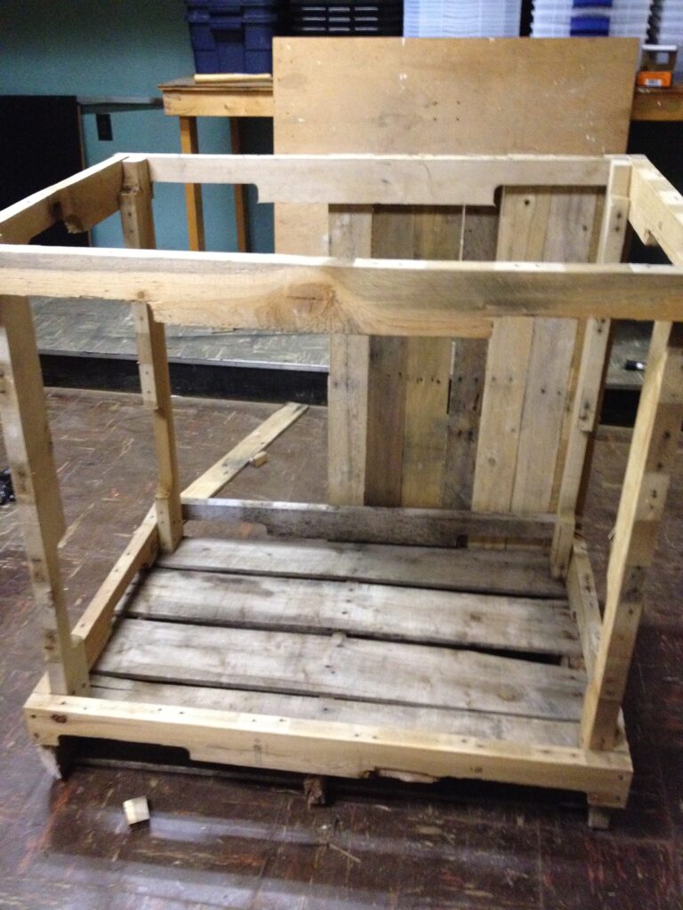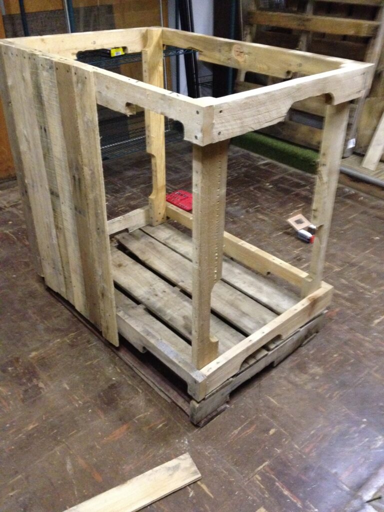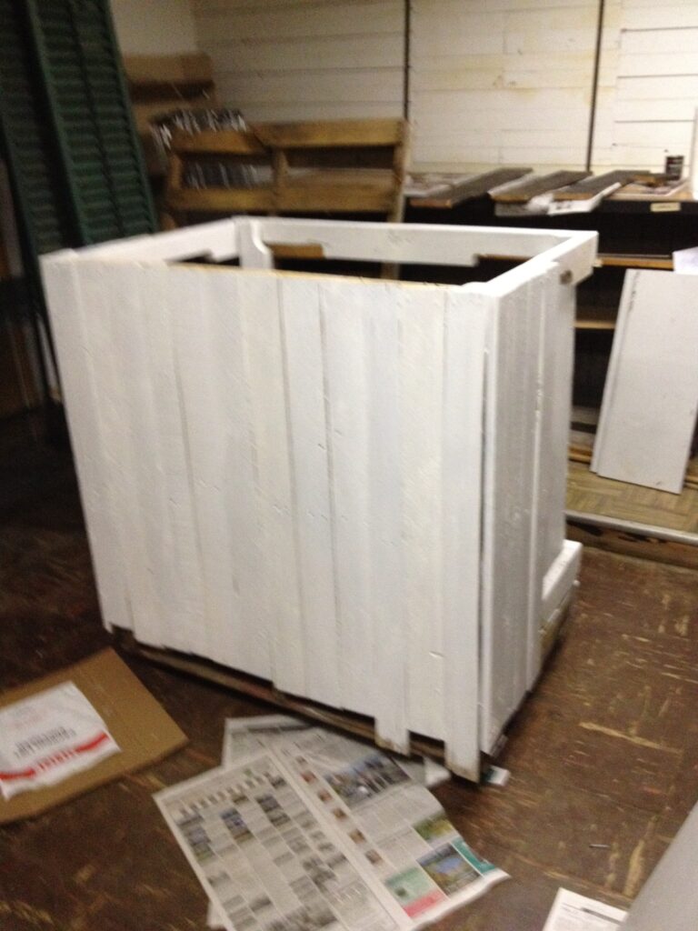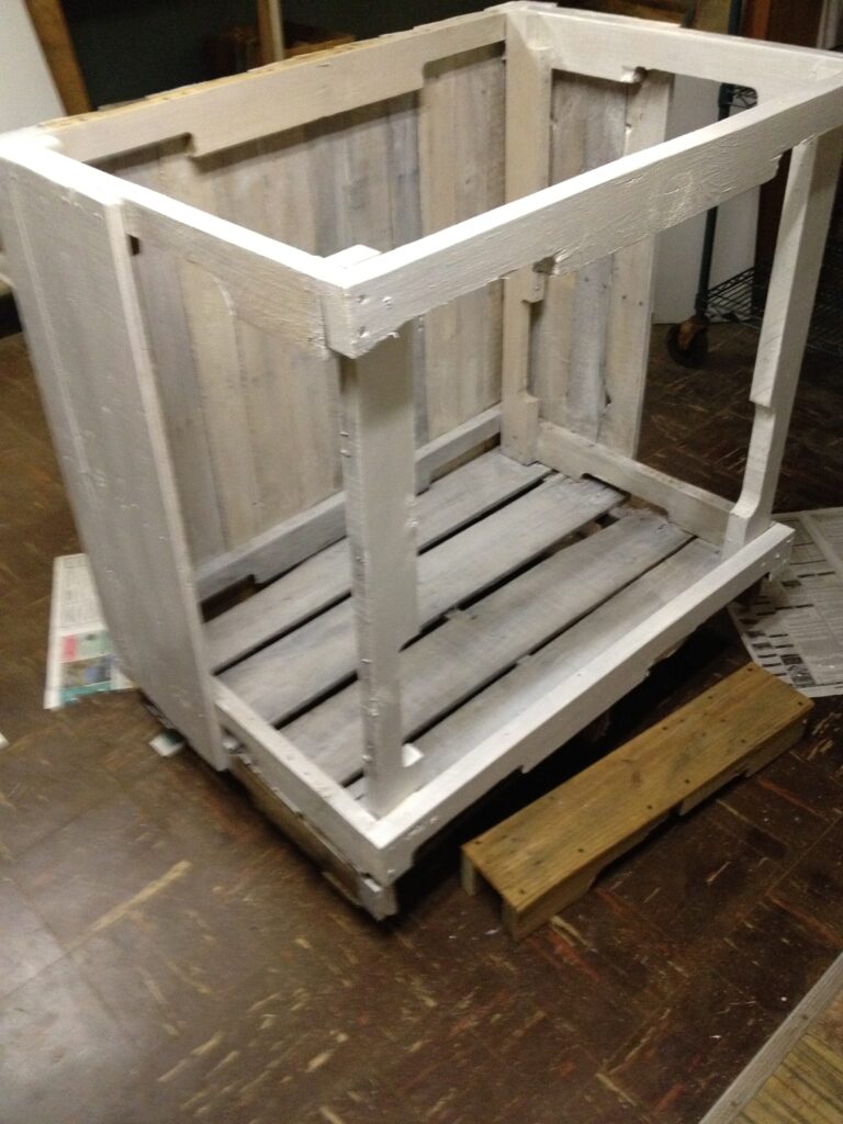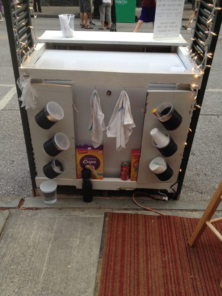 The whole thing is made out of recycled pallet wood, aside from the shutters that make the sides (which I got at a yard sale), and is on wheels so it could be moved outside for the street party events that downtown hosts every summer. We were able to borrow a projector to project the logo onto the front of the stand which I then hand painted. The back panels of the stand are removable so the freezer can be accessed for maintenance if needed. There are two additional counter pieces that can be set on top of the frame and a shelf piece that can be added half way up the sides so when it's not ice cream season, the piece can be used as a display case in the store. I strung up twinkle lights so when night fell during the street party, people would still be able to see the booth and I would still be able to scoop ice cream.