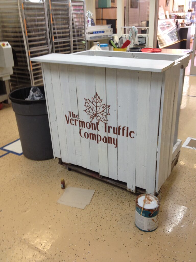 The summer months at the Truffle Co can be incredibly slow for business, so I thought it would be fun to start making ice cream! I made plain vanilla, mint chip, and a super rich chocolate ice cream. They were starting to sell well, so I thought it would be nice to have a specific booth set up for the freezer and all the accoutrements that goes along with it: plain and sugar cones, cups, napkins, and a water cup for the scooper. So I got to designing!