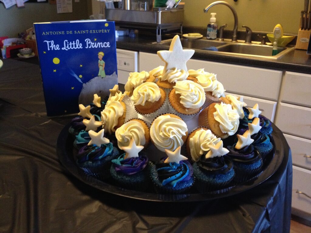 A cupcake display I made for a Little Prince themed baby shower. The swirled "galaxy" frosting was a first for me, and I was so pleased with how it worked out! The outer cupcakes are all topped with sugar cookie stars, and there's a big sugar cookie star on top of the moon.