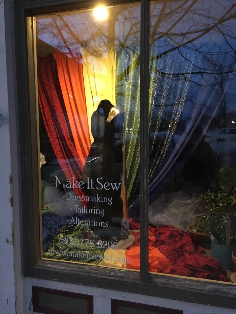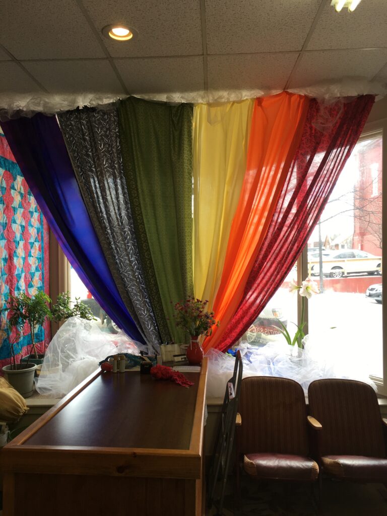 At the end of every rainbow there's a pot of gold! This window display was created for St Patrick's Day. The dress is a Grecian-style draped number with a one shoulder golden cape. The fabric rainbow is sandwiched between a tulle cloud, making this display look a bit ethereal.