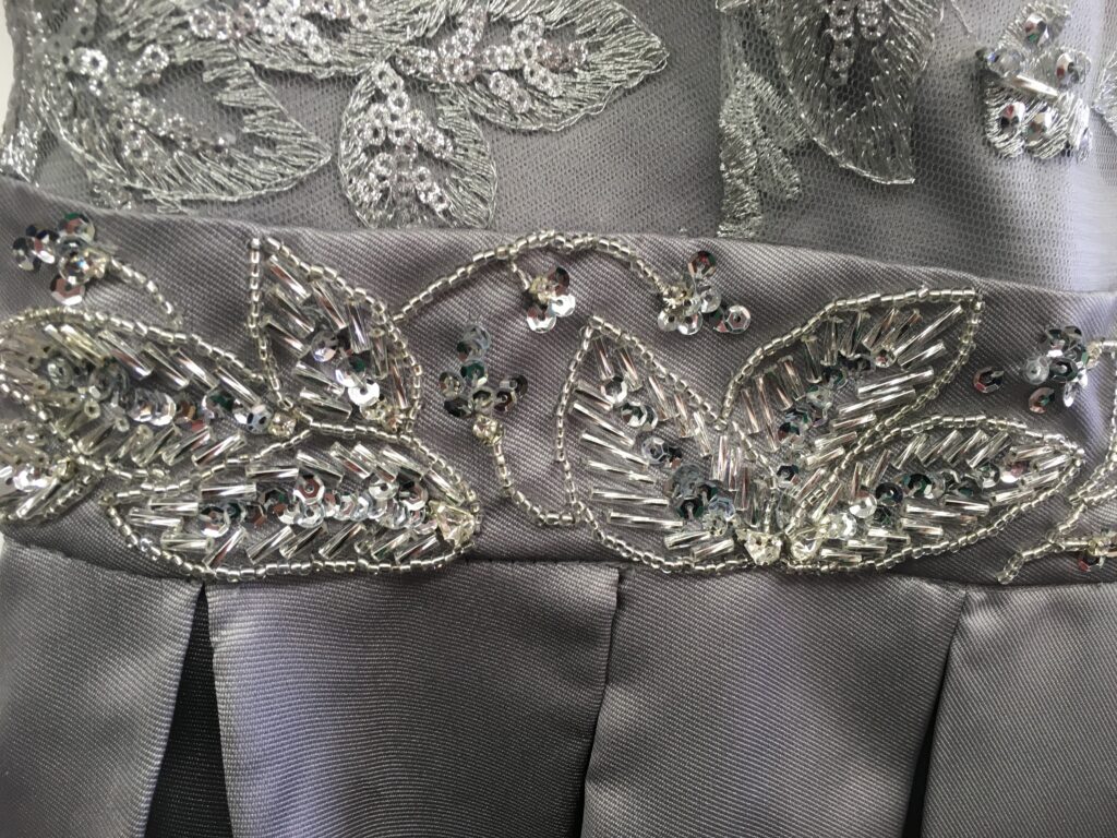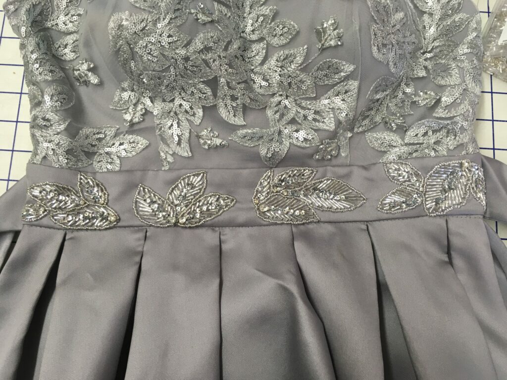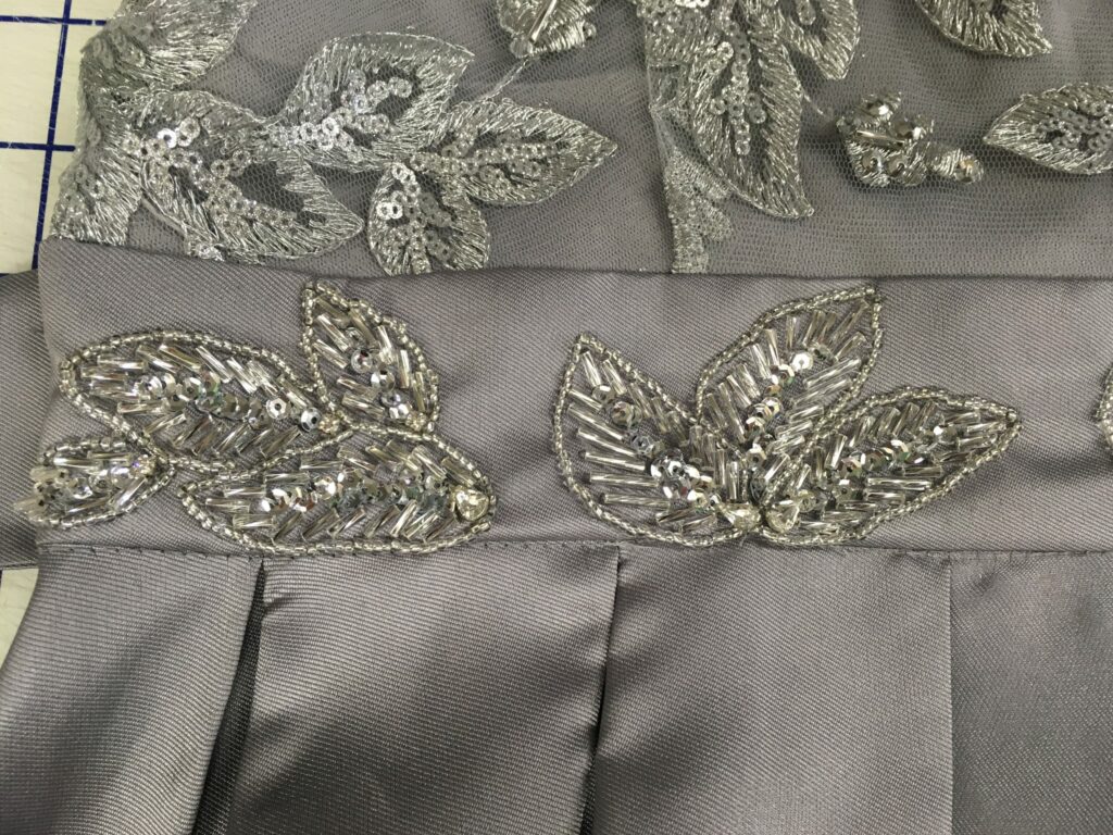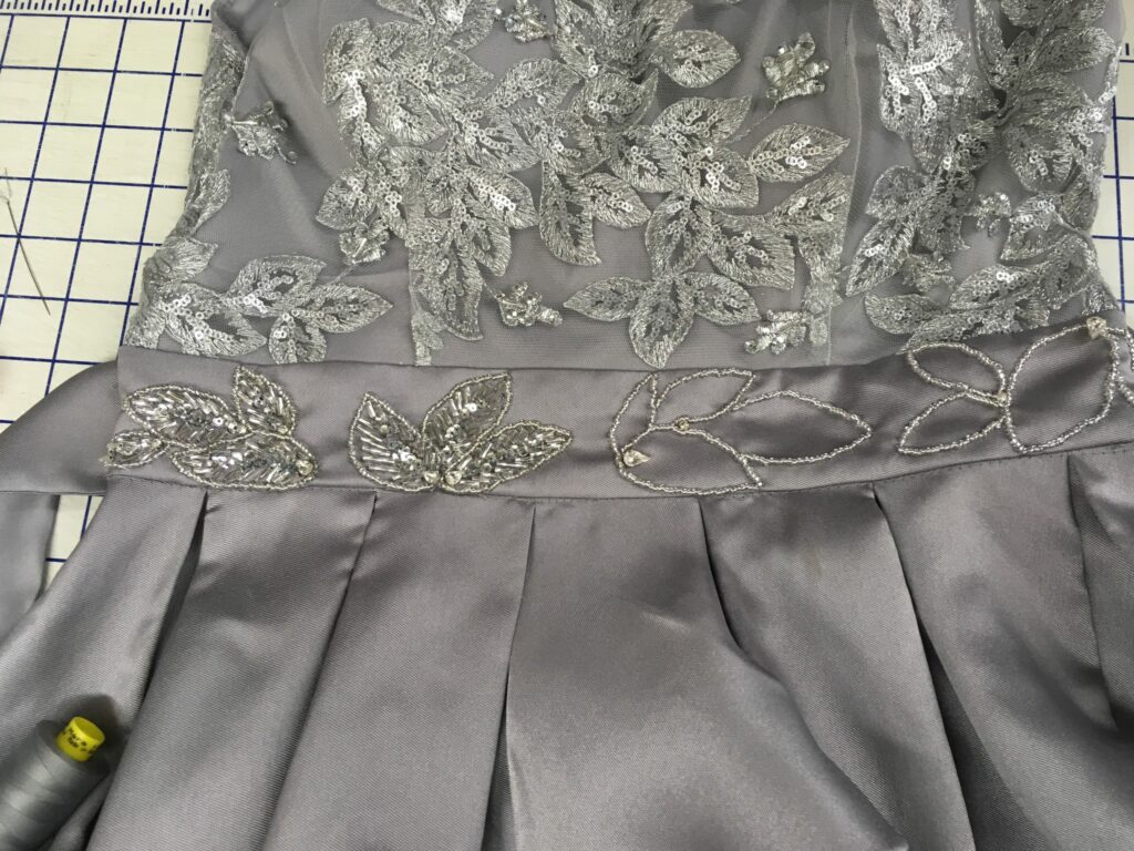 This lovely lady, Abby, brought us this gorgeous silver dress to alter and bling up to wear to her son's wedding in Israel! I added seed beads, bugle beads, and sequins strategically throughout the top and fully beaded the belt with a similar leaf motif.