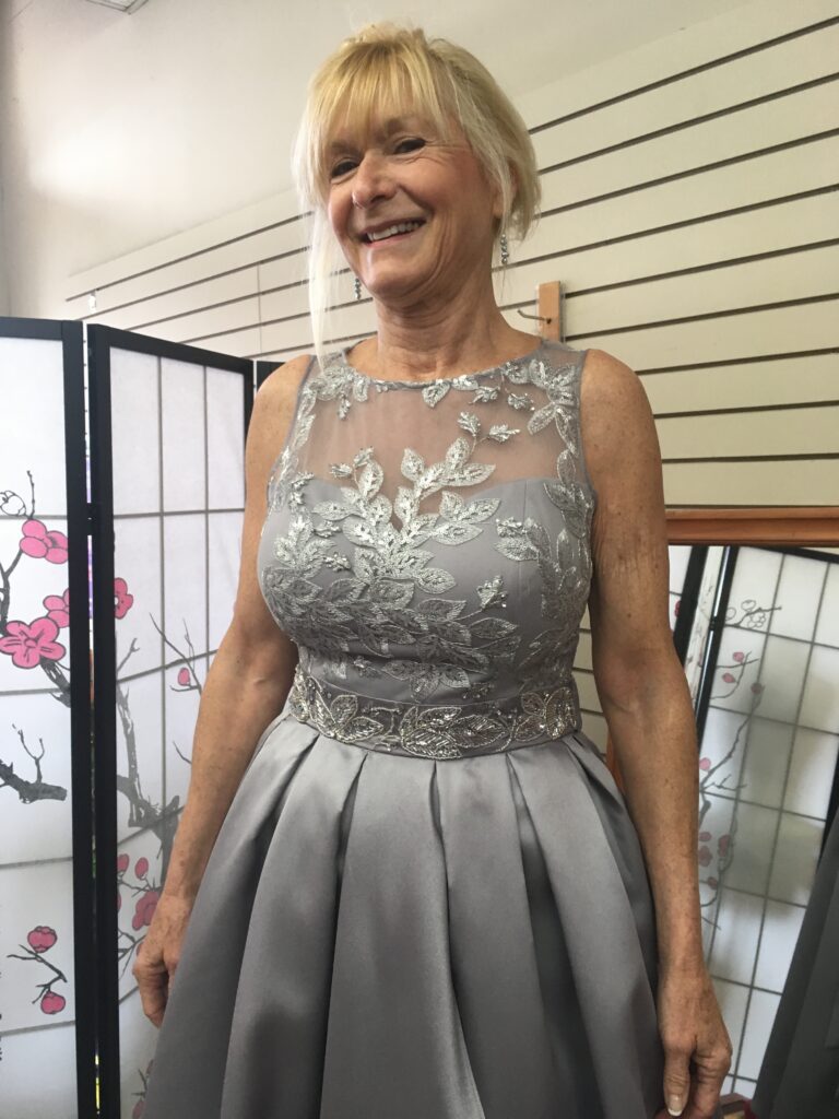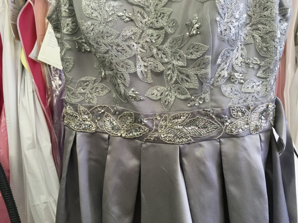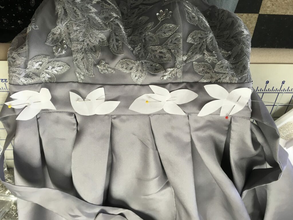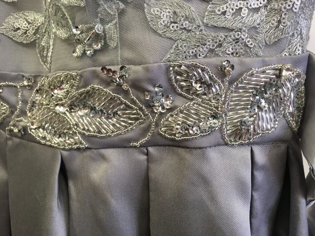 This lovely lady, Abby, brought us this gorgeous silver dress to alter and bling up to wear to her son's wedding in Israel! I added seed beads, bugle beads, and sequins strategically throughout the top and fully beaded the belt with a similar leaf motif.