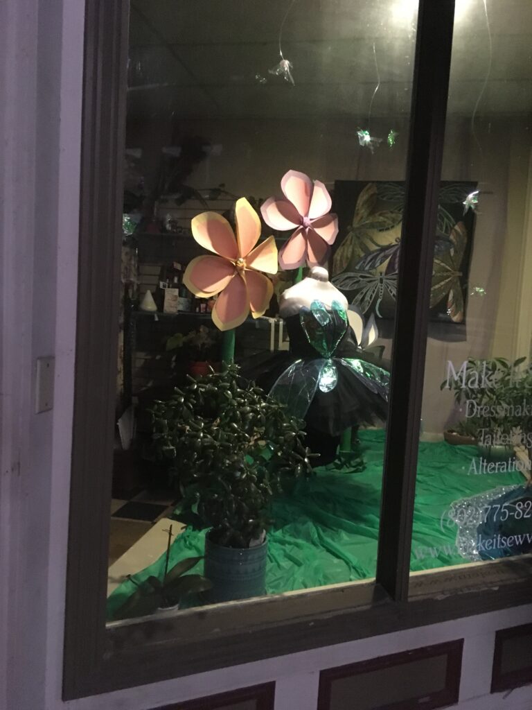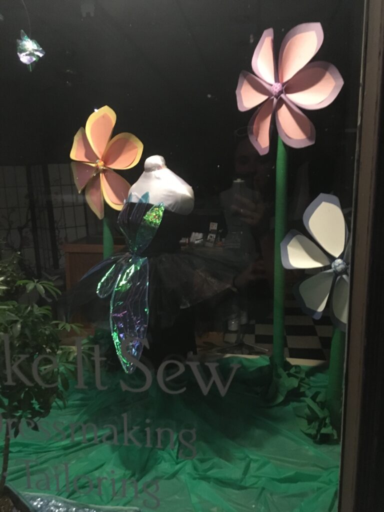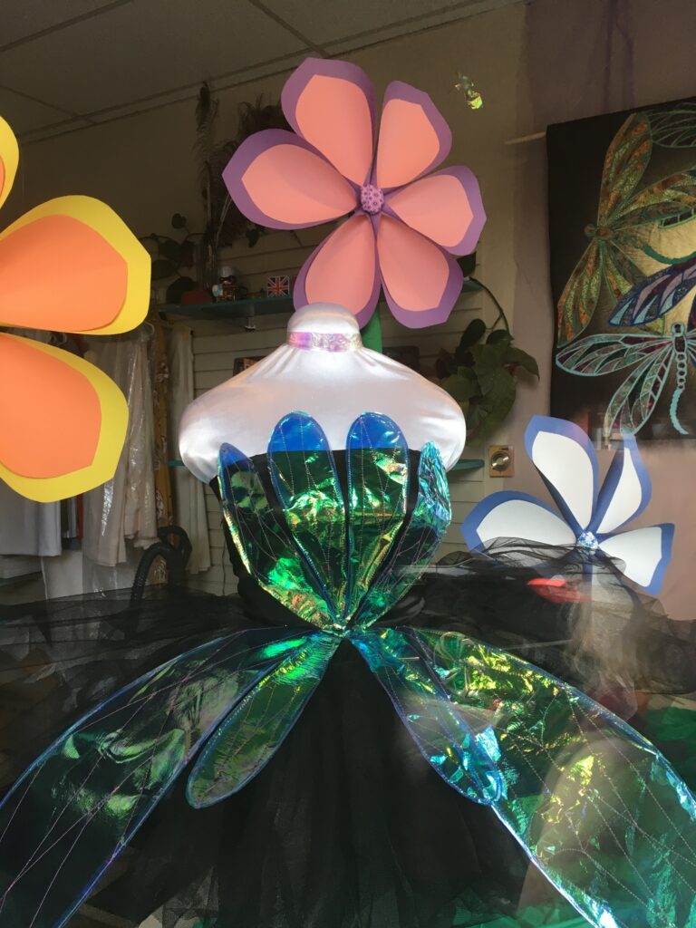 My boss' friend who made the quilt in the Visiting Artists post completed a dragon fly wall hanging and wanted to display it in the shop window. I went looking for inspiration to incorporate the wall hanging into the display and found a beautiful dragonfly costume on instagram and the pieces just fell together!