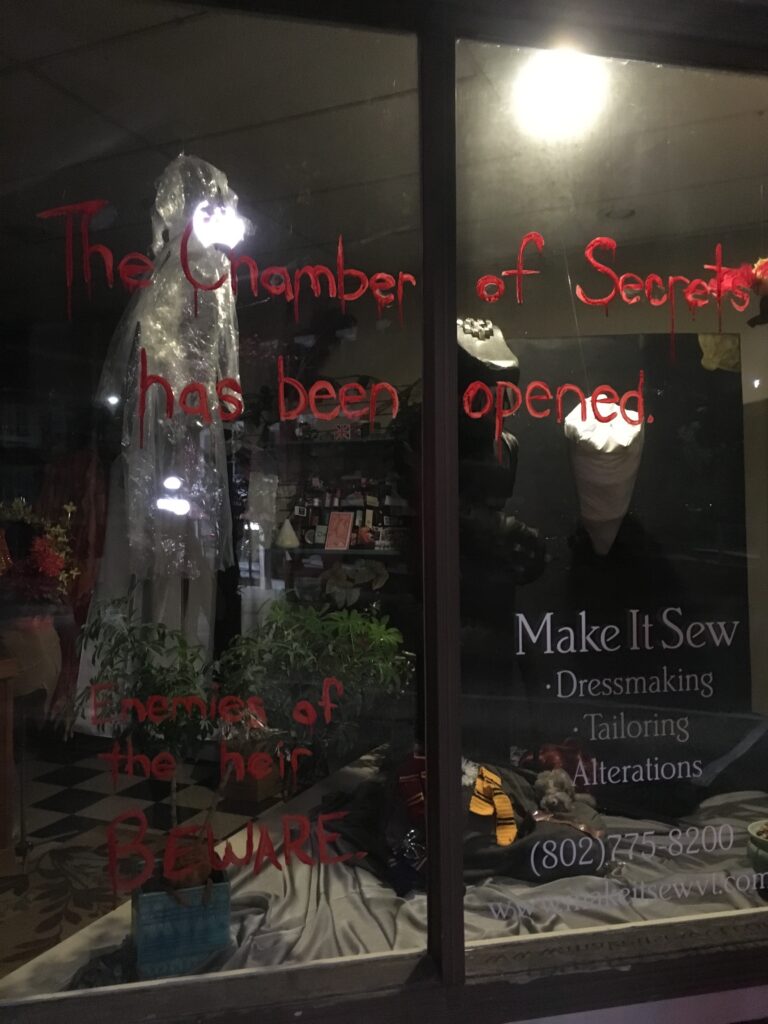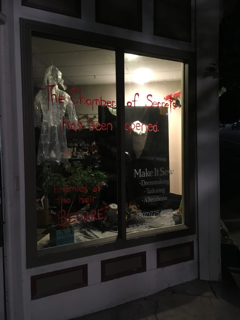 October is National Book Month and I got super inspired this year to create an elaborate book themed window display. I am a die hard Harry Potter fan (Hufflepuff for life!) and have been obsessivly listening to a podcast called Potterless, so of course they were the first books that came to mind! I chose to recreate Harry Potter and the Chamber of Secrets because the story really lends itself to the tableau constraints of window displays. Plus the scary giant snake seemed like a home run for Halloween!