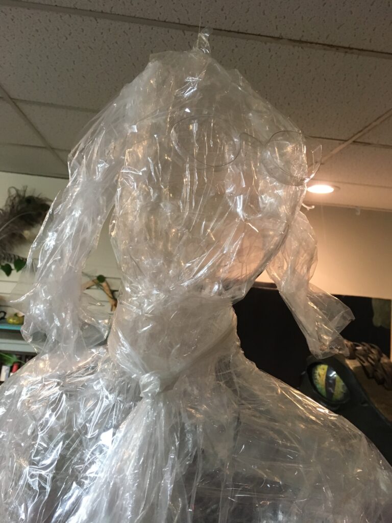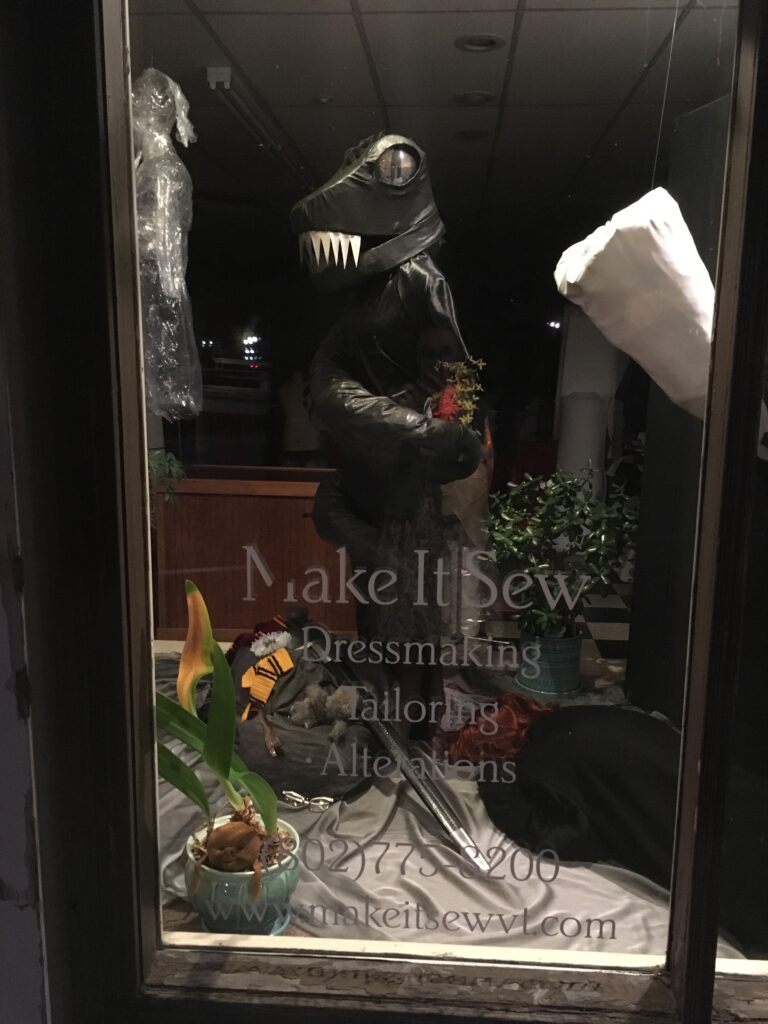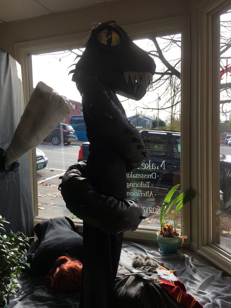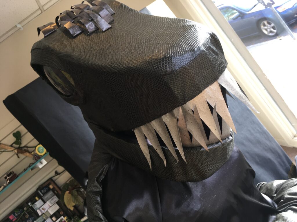 The fang is made out of a foam covered tomato cage, with a shiny white vinyl fabric spray painted to look like he hasn't brushed his teeth in a while...