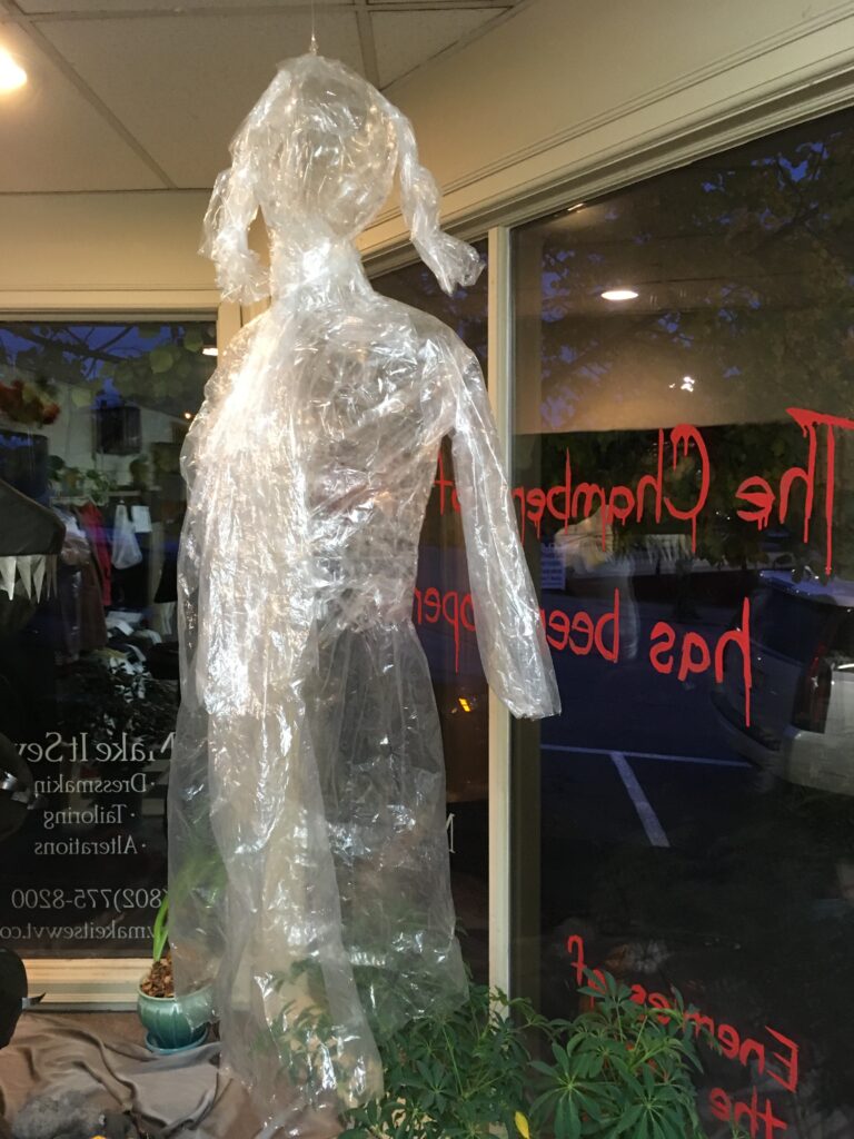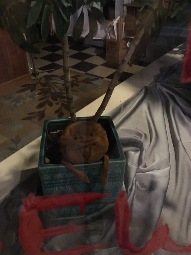 I had to paint the words on the inside of the window because of weather. To do this, I wrote out the phrase on white craft paper, hung it up on the outside of the window, came back inside and just followed the lines. I watered down some red craft paint so it would get drippy, like blood!