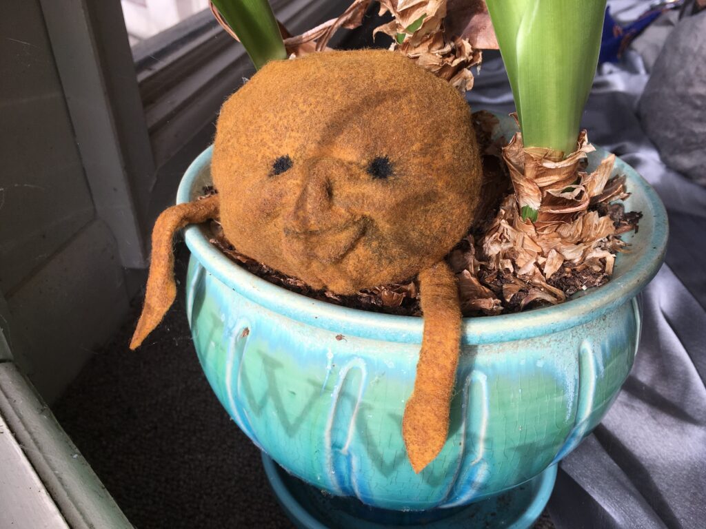 Mandrakes! Made with brown felt and hand sewn into silly faces.