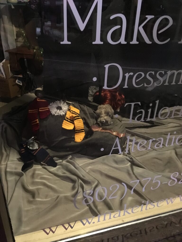 I put a dress form in a black cloak and a red wig to represent Ginny and laid her down in the front of the display, as pictured here. I'm sorry to say it scared the bajesus out of people! We had a number of people rush into the shop to make sure the woman in the window was ok. Oops!