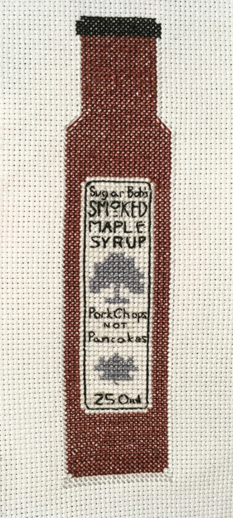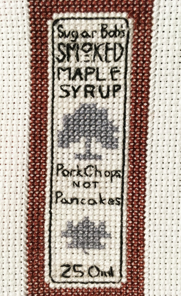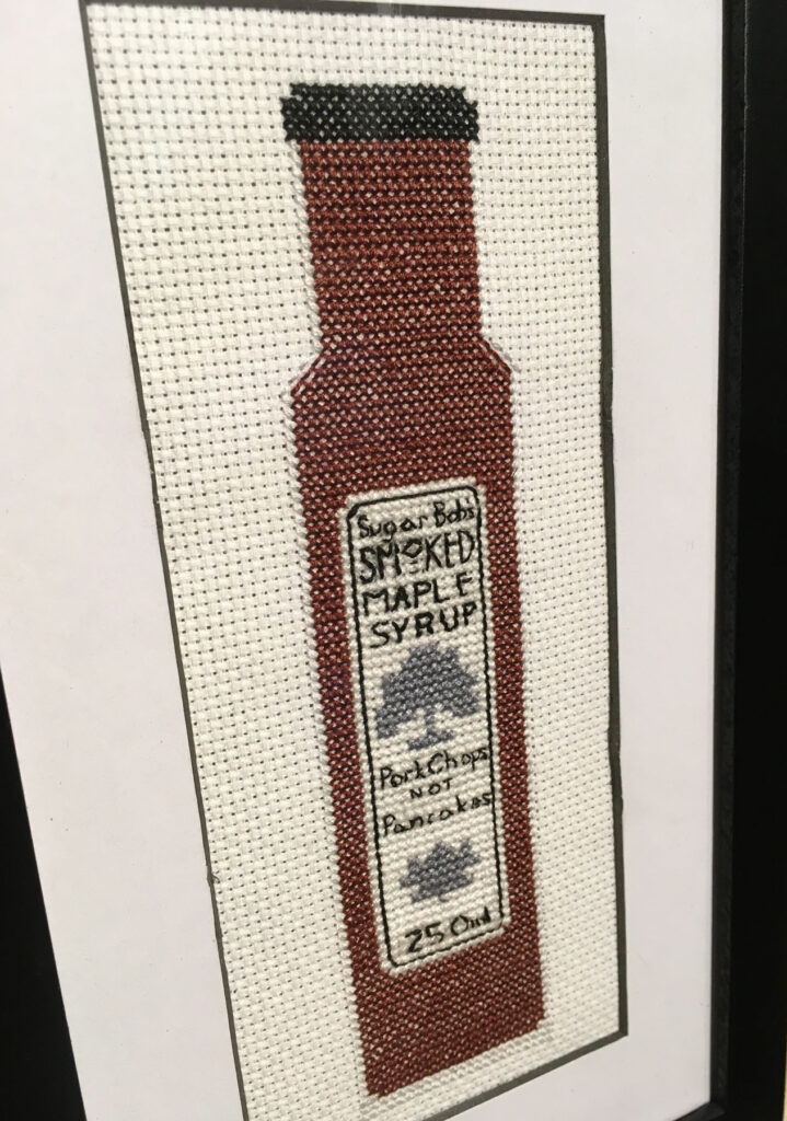 I guess this could be considered fanart??? I designed this cross stitch pattern based on a bottle of Smoked Maple Syrup from Sugar Bob's Finest Kind. I work for SBFK and thought it would be a fun project to make and give to my bosses.