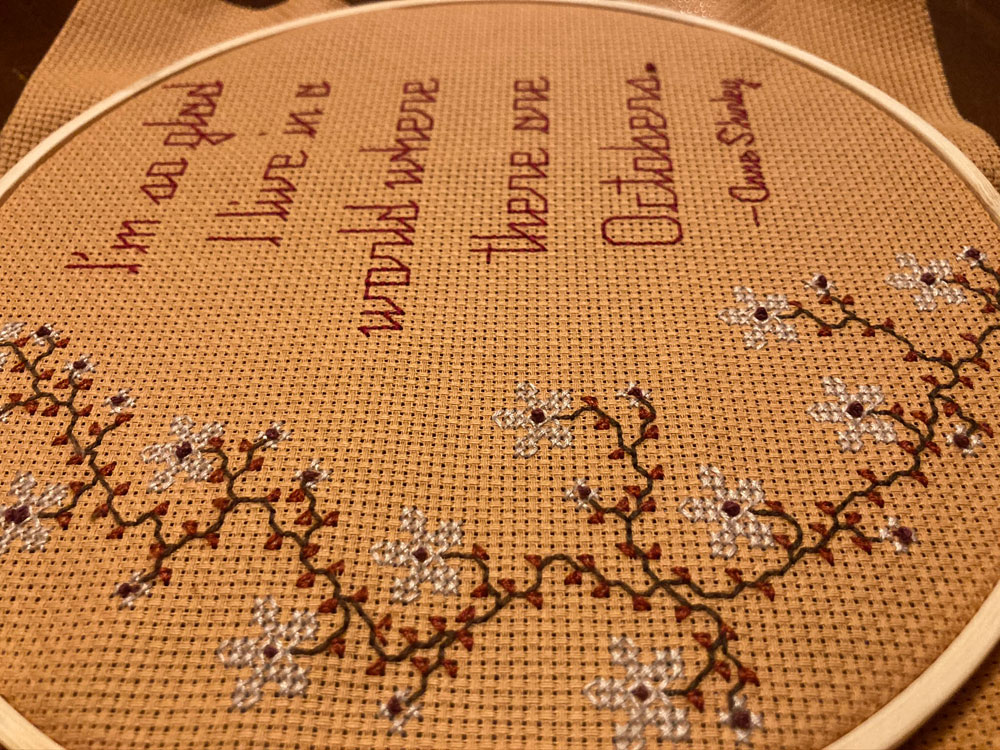 I have been more or less obsessed with Anne of Green Gables lately, whether in the form of Netflix's Anne with an E or listening to the first three AoGG audio books, or watching the spinoff series Road to Avonlea, so when I saw this photo on Pinterest I just HAD to use it as inspiration for a cross stitch project.