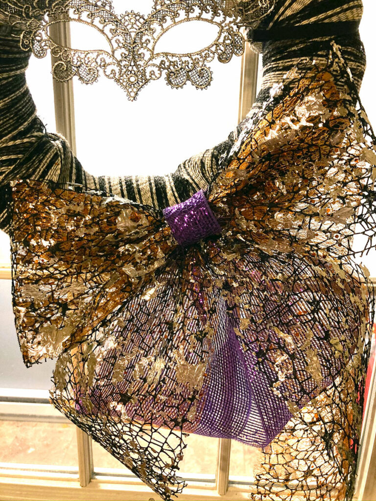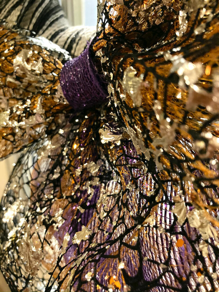 To make the bow, I layered the purple under the the orange sparkly mesh and topped it with the black and sliver web-like mesh for some classier Halloween-y vibes. The bow is also pinned into place.