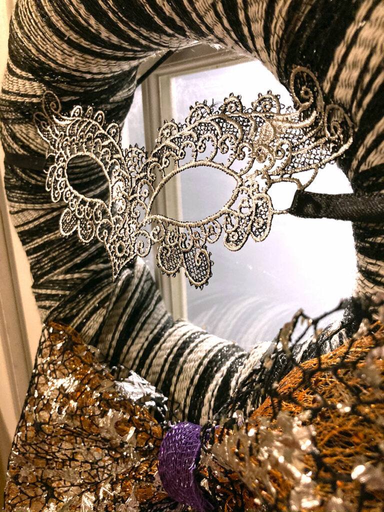 To top it all off, I pinned the mask (using the ribbon straps that came attached to the mask) in the center of the wreath for some added drama.